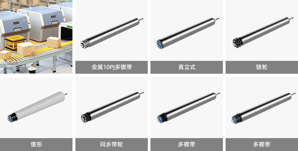 - 标准化产品:一般滚筒电机的尺寸为:300mm、400mm、500mm、800mm,p50mm、p60mm、p76mm等多种直径。以及直通式、塑胶多楔带、金属多楔带、钢制双链轮、同步带轮等多种驱动链接方式,支持标准化生产制造。